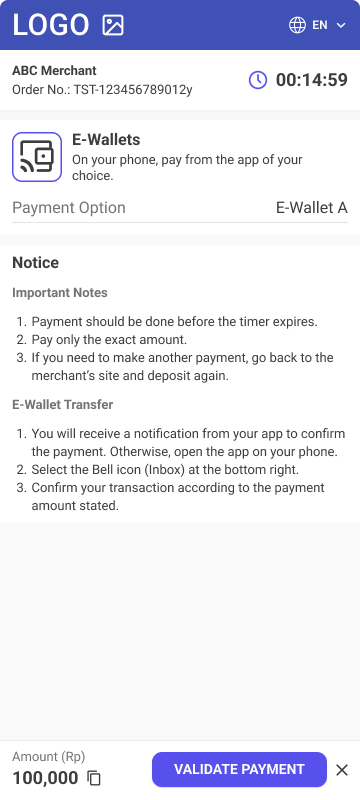 Description - E-Wallet is payment method on Indonesian market which allows customers to use major Indonesian digital wallets for payments. Customer is either automatically redirected to chosen wallet with all payment details pre-populated to finalize the payment or directly receives push notification to authorize the payment in case of OVO wallet.