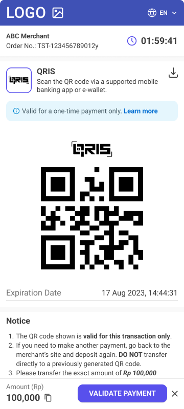 POST /payins/{idPayin}endpoint requestExternal payment reference - Not required to provide the external payment reference during the payment completion. Payment amount to be sent has to be amount from DuitNowMethodResponse.moneyRequired to successfully recognise the payment request.