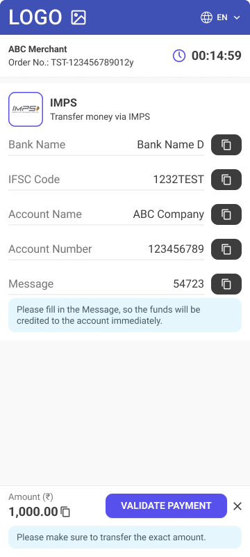 Description - It is basically Wire Bank Transfer variant for the Indian market when customer is informed during the payment flow with the instruction how to create bank transfer to pay your payment order.
