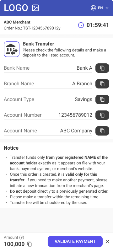 Description - Payment method which requires customer to copy Payment instructions from the Payment application or our API response and create the Payment transfer using the instructions within customer’s own payment service such as Internet or mobile banking or wallet. As the Payment relies on the customer offline Payment transfer processing it can take minutes for Payment to be confirmed and also Payment expiration ratio can be higher. For VND payments, customer can simply scan displayed QR code instead of copying Payment instructions.