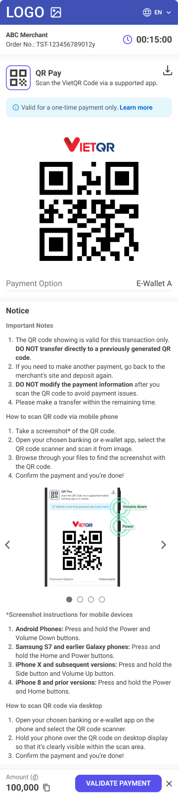 Description - Viet QR is a payment method intended for the Vietnamese market which allows customers to pay using scanning QR codes by theirs payment application or internet banking.