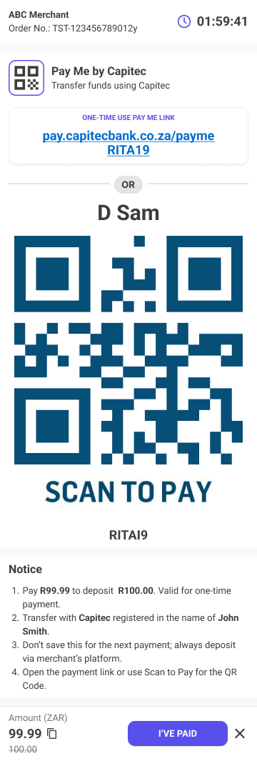 Description - Pay Me is a payment method intended for South African market which allows customers to send payments by simply scanning QR codes using Capitec Bank app. This payment method is available only for payments between Capitec clients.